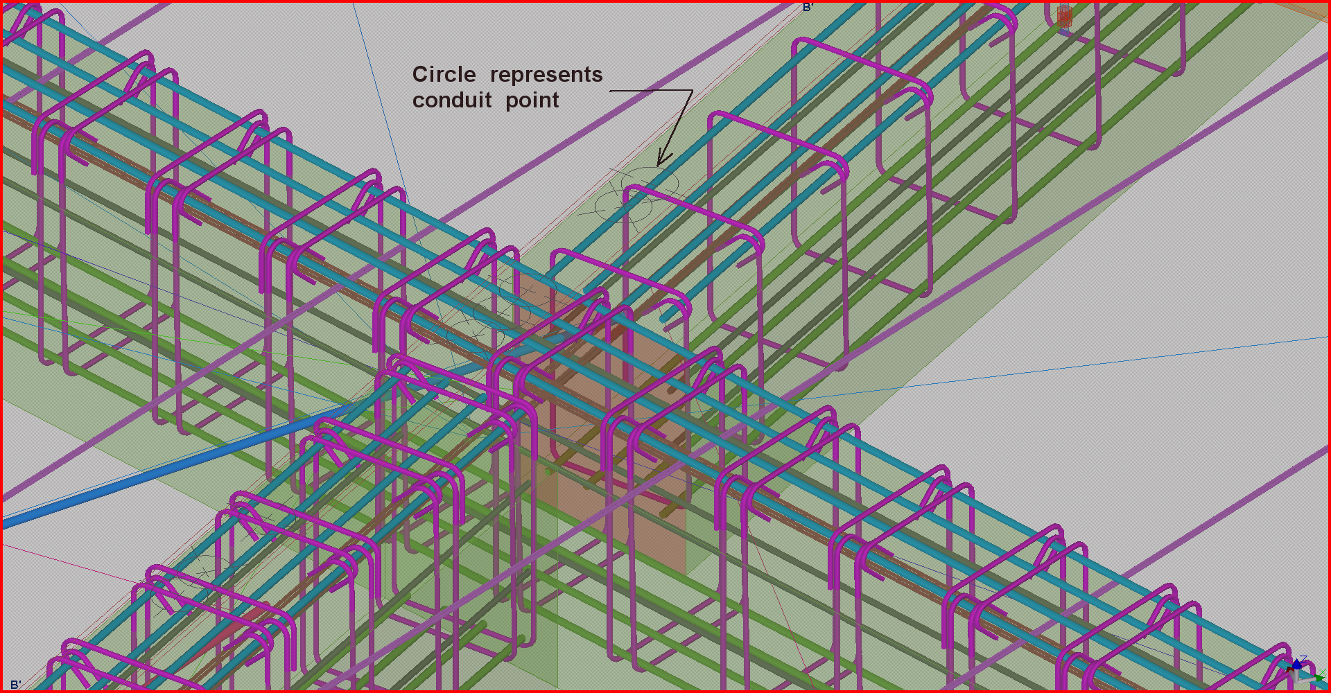 Note pink structural element in duct, 2D location of pipe penetration symbols