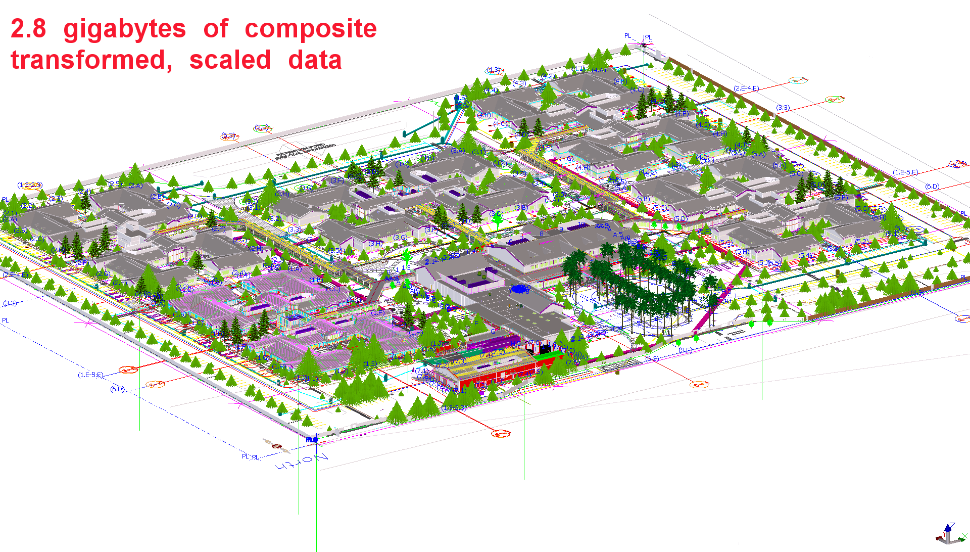 There are over 136,000 laser scans. We track these laser scans with a Lucrosol innovation, a Laser Scan Identification Module program, which allows trade contractors to locate the scan they need. There are over 250 types of piping systems. Mutiple types of 3D and laser scan software were used daily, the main software in use in Navis Manage. In my forty year career I have never seen or heard of a more technically challenging yet successful VDC / BIM project.
