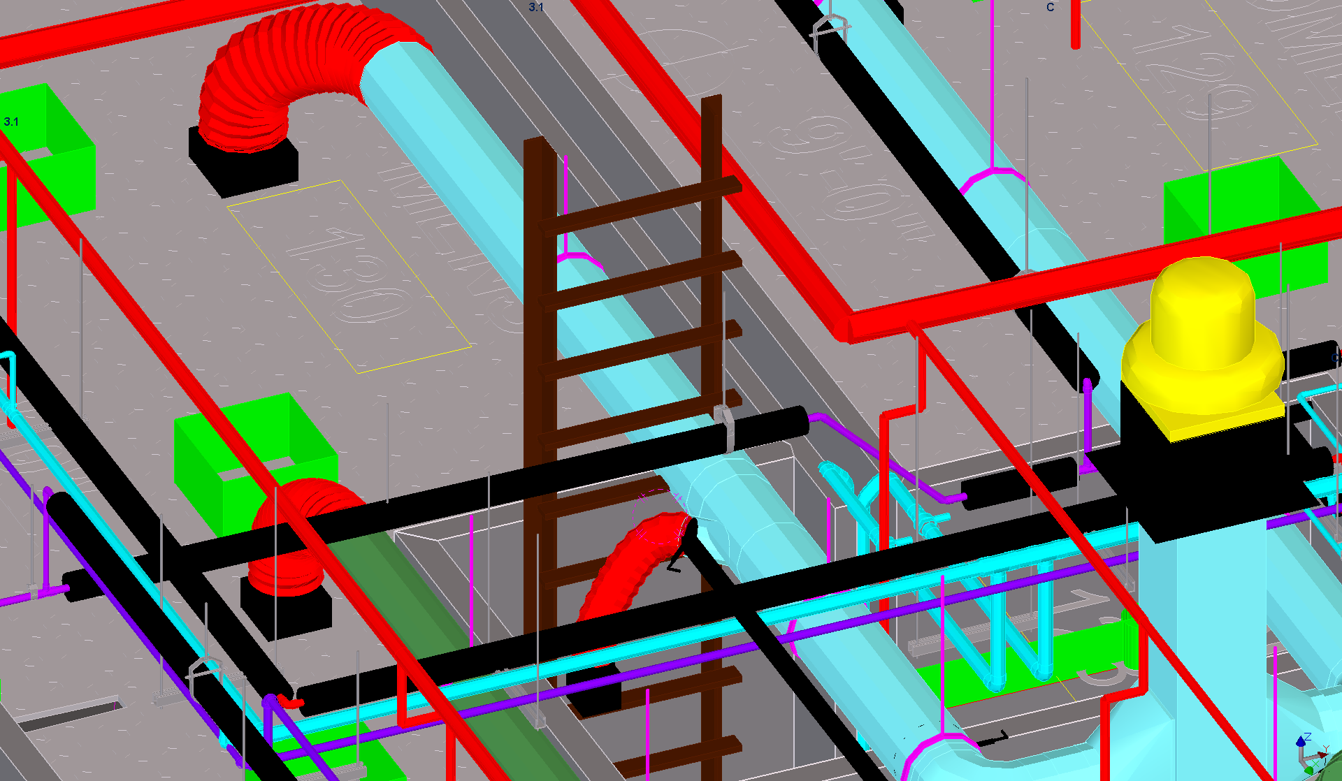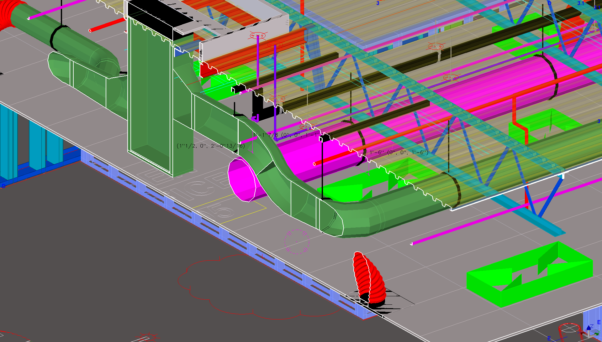 Note pink structural element in duct, 2D location of pipe penetration symbols