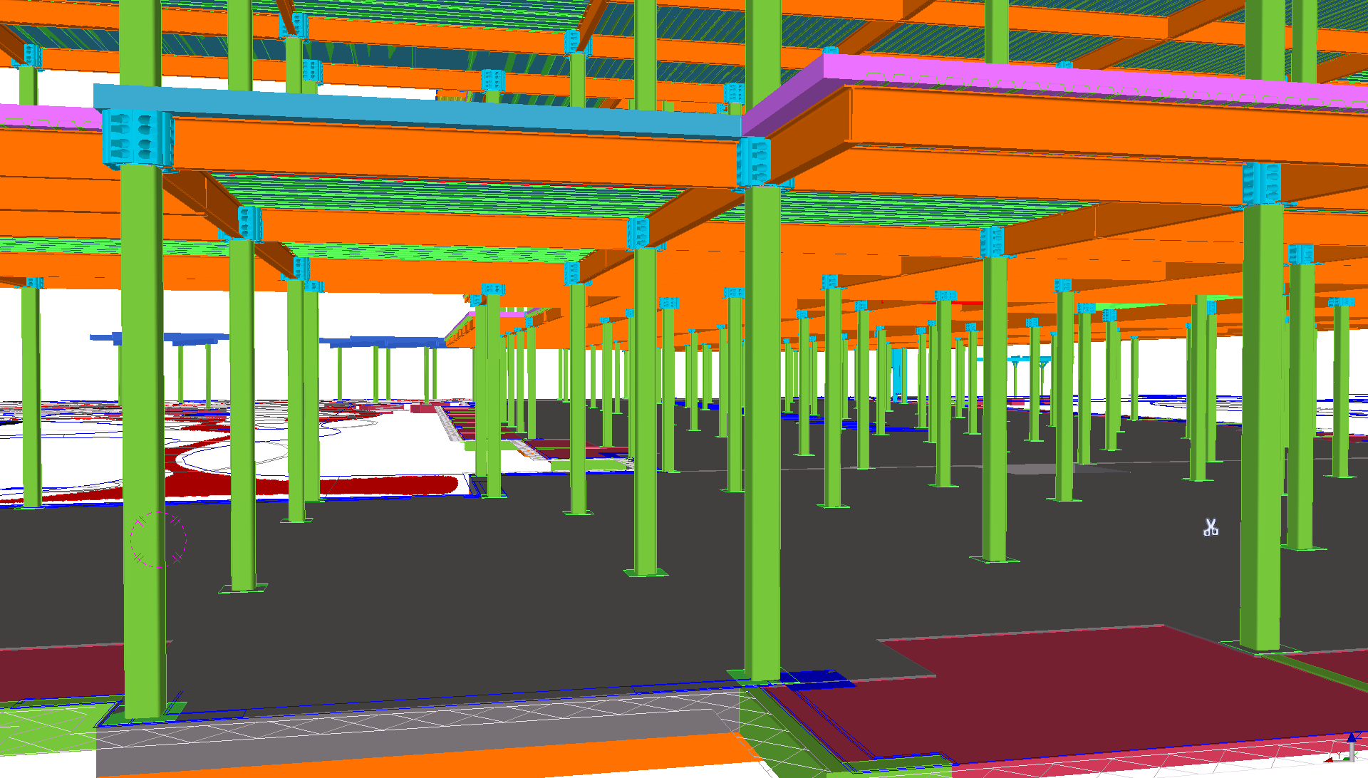Using the subcontractor 3D and 2D shop drawings, design drawing and equipment submittals LucroSol coordinated the following systems: mechanical, plumbing, gas, electrical, structural, light gauge metal stud, architectural, exhibits, drop ceilings, lighting, hangers, shop drawings, crane locations, materials staging locations, and many other daily activities.
